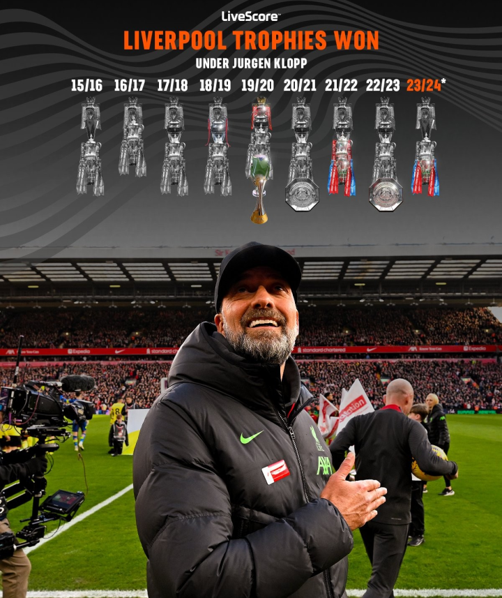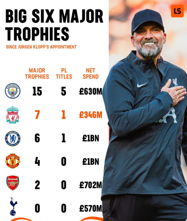 在克洛普去年离开之时,LiveScore的一项Big6在净投入和奖杯数量的对比中,克洛普所率领的利物浦是获奖次数第二多的球队,却也是净投入最少的球队。
