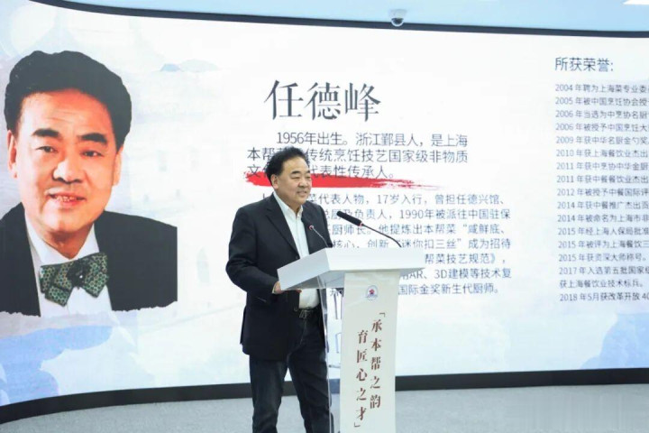 在对话大师环节,上海本帮菜肴传统烹饪技艺国家级非物质文化遗产代表性传承人任德峰就处于起步阶段的学厨如何本帮菜技艺给出了专业的建议。他也通过分享自己的经历和经验,让在场同学明确了一份责任——学习上海本帮菜肴烹饪是一项“硬功夫”,要下“苦功夫”。