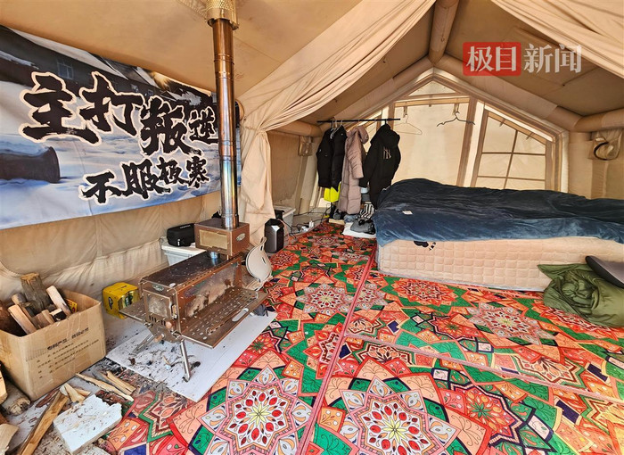 极目新闻记者看到,夫妻俩搭建了两顶帐篷,内部均放置了柴火炉。其中,一间作为厨房,另一间作为卧室。为了抵御漠河的极低温度,他们还购置了柴暖放在卧室,室内温度维持在20℃以上。
