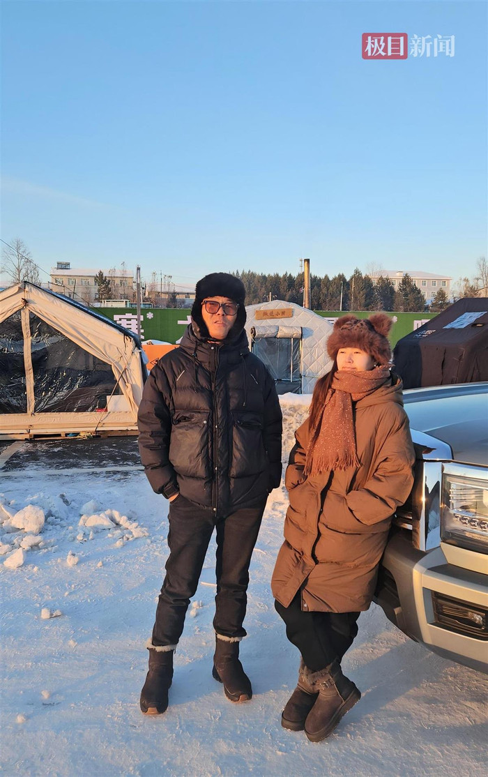 在营地走访时,极目新闻记者看到不少自媒体博主正在进行直播,他们一边在自己搭建的帐篷前走动,一边和评论区网友互动,吸引更多网友关注。其间,正在整理新帐篷的男子老顾告诉极目新闻记者,他和妻子康康是一对自驾游博主,经营着名为“叛逆夫妇”的视频账号,两人均为80后,来自陕西渭南。今年9月,“叛逆夫妇”夫妻驾驶SUV来到黑龙江漠河市桥北自驾营地,在此搭帐篷露营开启极寒挑战。
