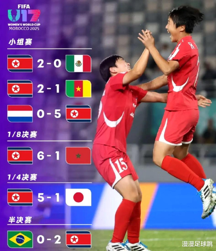 如果说小组赛只是展现实力的开胃菜,那么淘汰赛才是朝鲜女足震撼世界足坛的开始:1/8决赛:6-1摩洛哥,这是实力碾压,几乎从开场就失去悬念。1/4决赛:5-1日本,这可是亚洲层面的巅峰对话,日本U17女足在技术与青训体系上公认世界前列,但这一次被朝鲜完全压制。半决赛,2-0完胜巴西队,再度零封强势晋级决赛,2年连续闯进U17世界杯决赛,足以傲视世级青训体系。