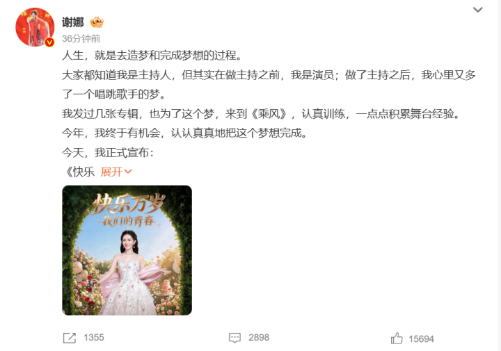 4月11日,谢娜发文官宣个人演唱会,相关话题冲上热搜。