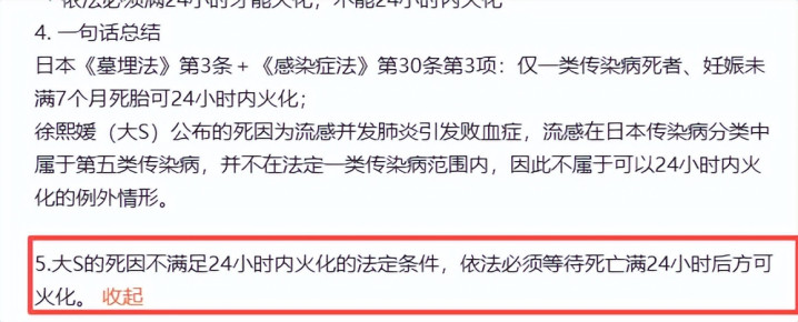 其实之前他就暗示过,着急火化,是这家人想要隐藏什么,这次直接表示在日本,能够不到一天内火化的几种病大s都不符合,所以说必须要等到去世满一天才能火化。